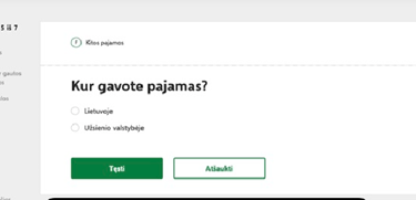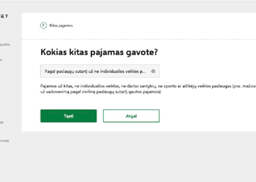 8. Kitame žingsnyje pasirinkite „Pagal paslaugų sutartį už ne individualios veiklos paslaugas gautos apmokestinamos pajamos“ ir spauskite „Tęsti“: